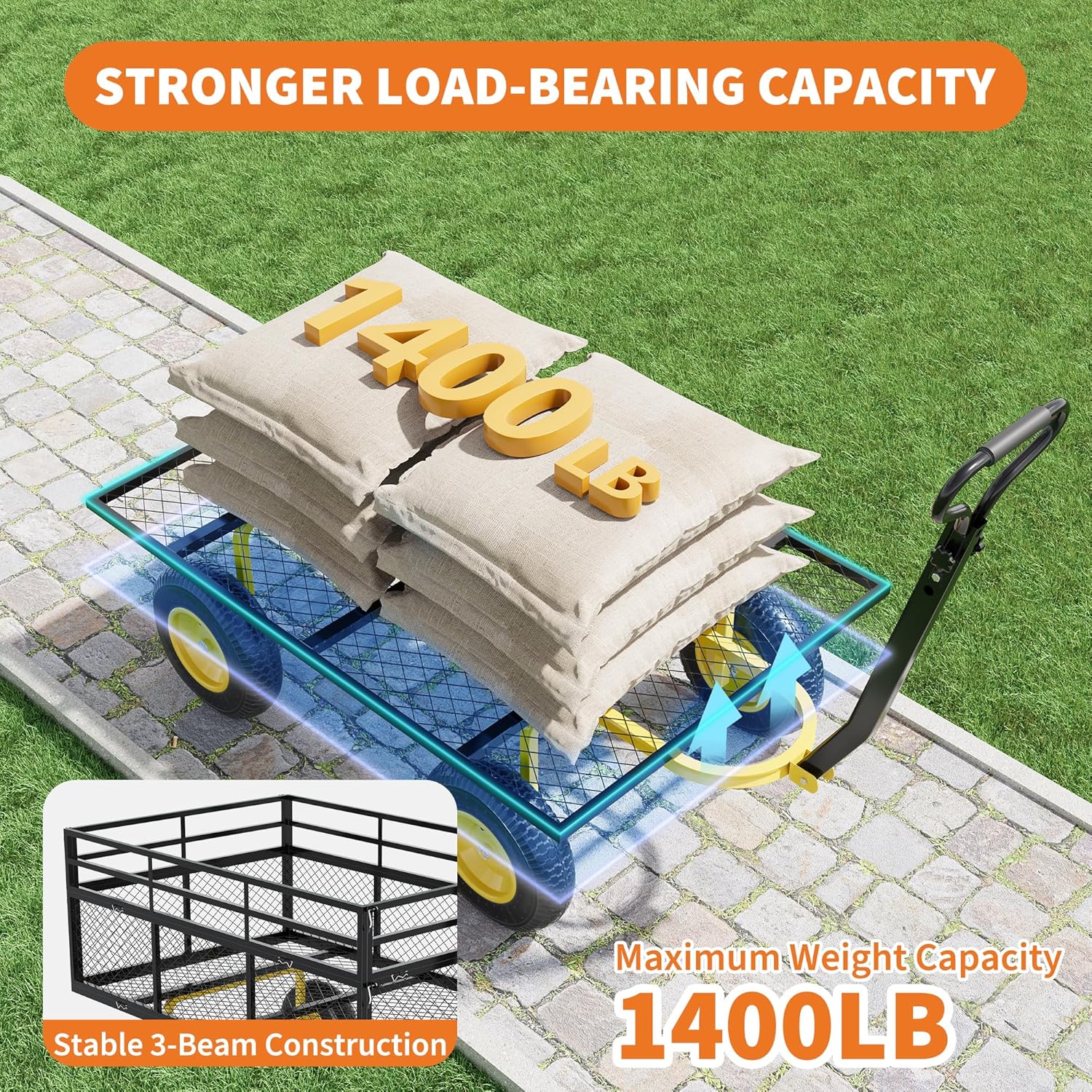 3-in-1 Heavy-Duty Steel Garden Cart, 1400 Lbs Garden Wagon, with 13 Inch All-Terrain Tires and Removable Mesh Side Panels, 180° Rotating Handle, Metal Utility Yard Trailer, Outdoor Gardens Wagon Cart