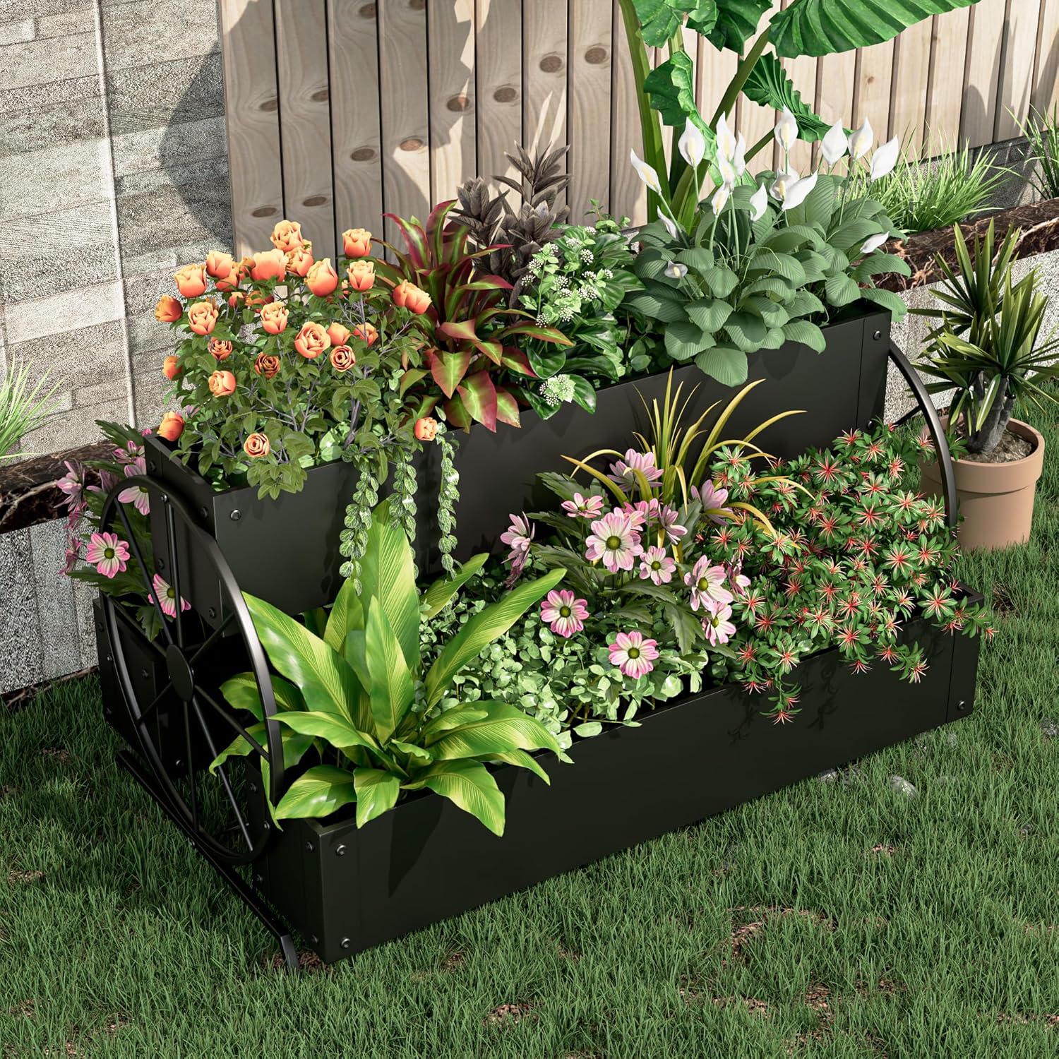 Metal Wagon Planter Box, 3-Tier Garden Planter with Wagon Wheels, Decorative Outdoor Planters for Flowers Herbs Vegetables, Flower Cart Small Raised Garden Bed for Patio, Balcony (Black)