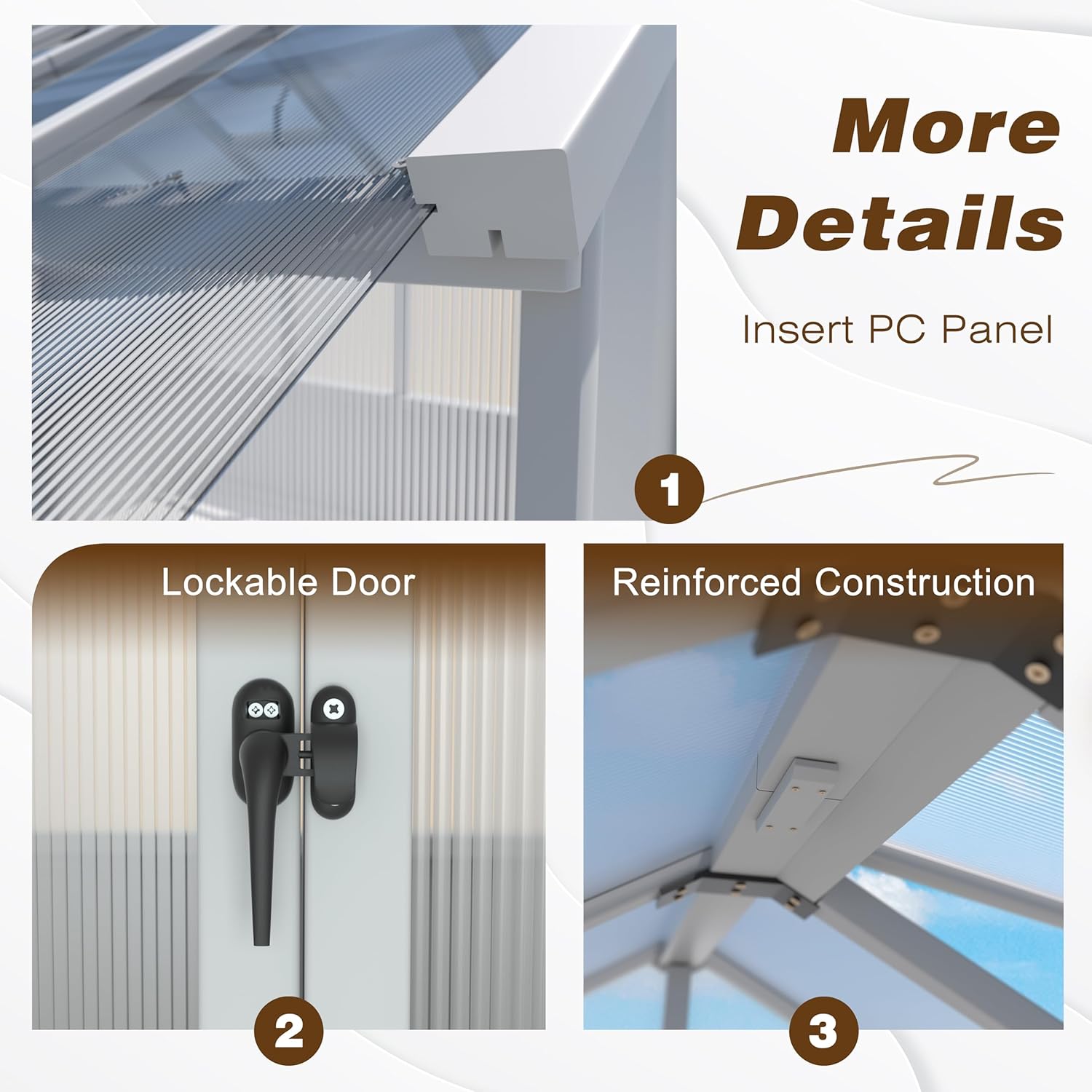 - Advanced Polycarbonate Panel - The greenhouse for outdoors is crafted with a 6mm thick polycarbonate panel. The maximum light transmittance of the panel can reach 89%. Even if it is exposed to the sun for a long time, there will be no yellowing, fogging or poor light transmittance. In addition, the it has an anti-ultraviolet (UV) coating, which can effectively block ultraviolet rays from passing through, has good weather resistance, is not easy to age and has long service life