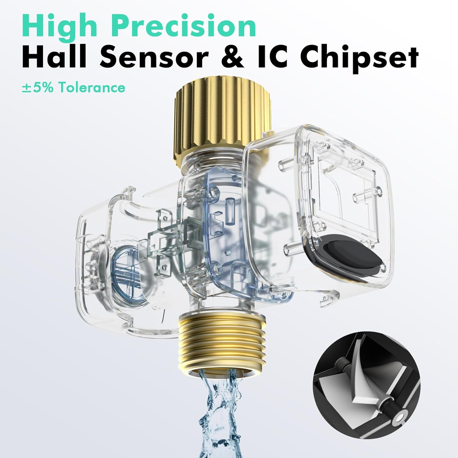 - Built-in with hall type sensor and IC chipset, which provide more accurate measurement and precise calculations. The measurement tolerance is less than 5%, great to measure how much amount of water are used and prevent over-watering.