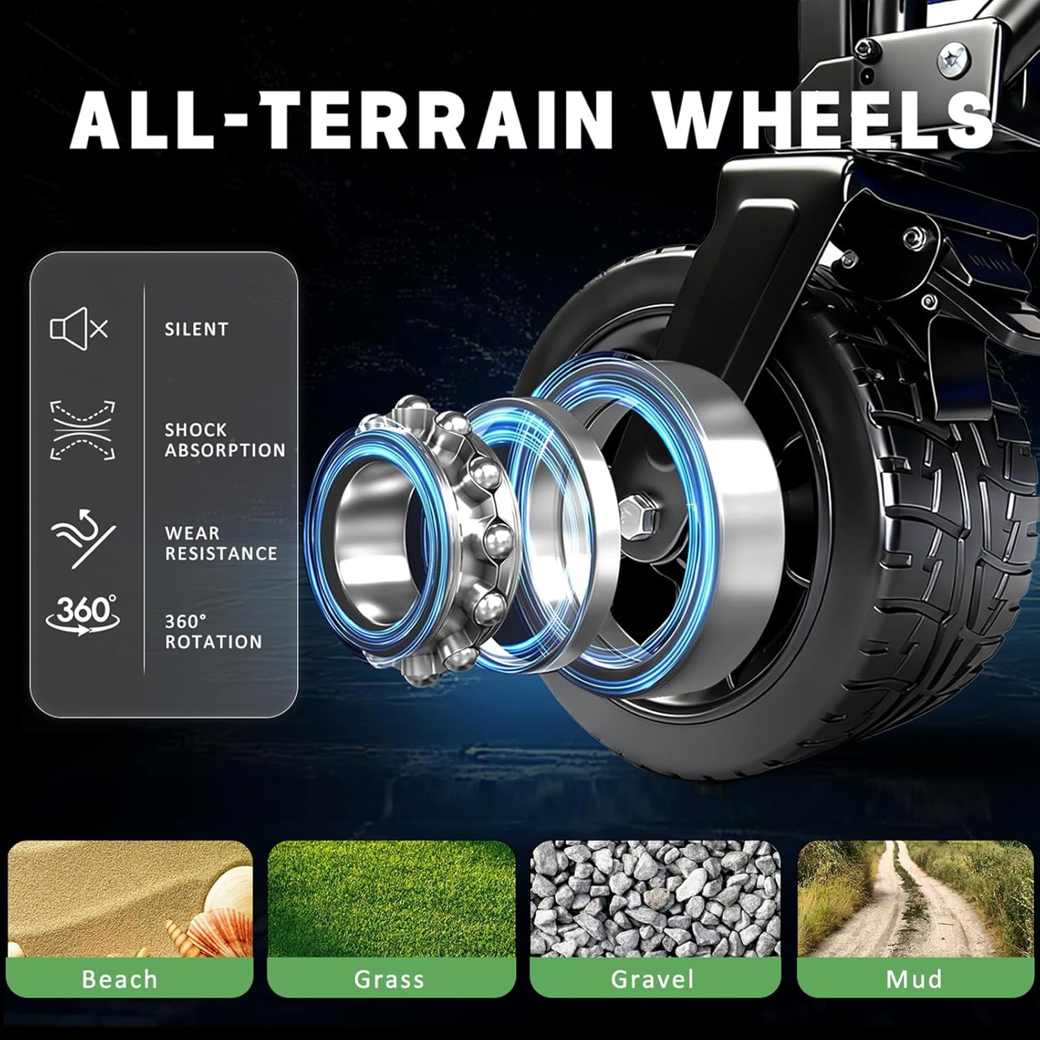 - All-Terrain Wheels & Ergonomic Control: Equipped with oversized 7-inch wheels that rotate 360°, this foldable wagon rolls smoothly over sand, grass, mud, and rough trails. An ergonomic handle rotates 90° forward and backward, making it easy to maneuver for users of different heights.