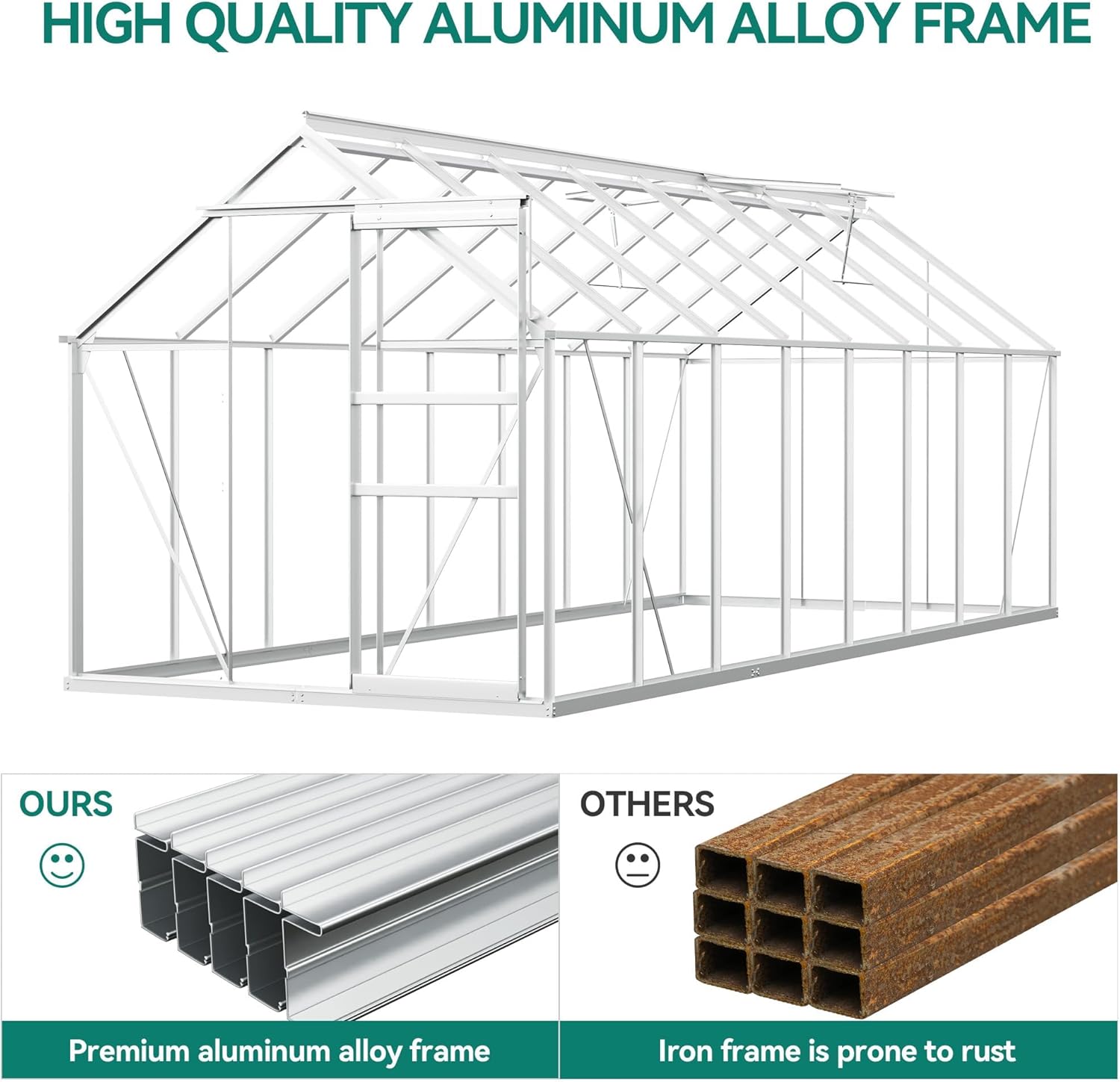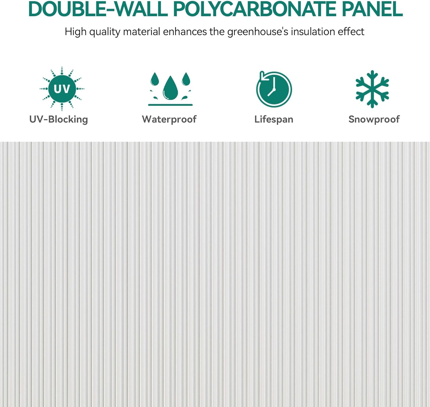 - UPGRADED MATERIALS - 16x6FT polycarbonate greenhouse is constructed using a reinforced aluminum alloy frame, along with reinforced rods on the sides and diagonal rod fixation for enhanced sturdiness and load-bearing capacity; Double-wall polycarbonate boards with 4mm UV protection effectively blocks 99% of UV radiation to protect your plants
