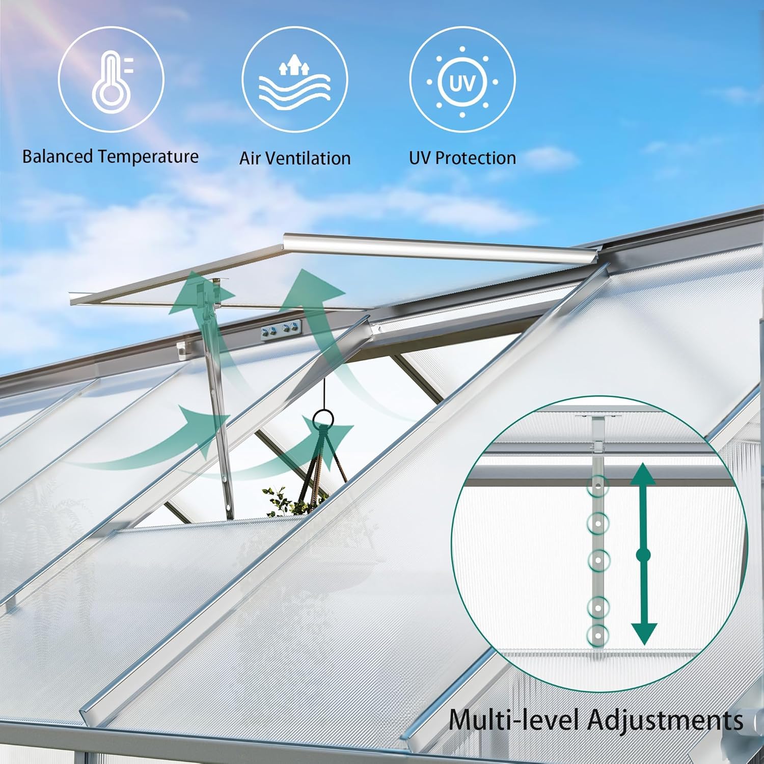 - ALL SEASON GREENHOUSE - Top tilt angle design of the polycarbonate aluminum greenhouse helps to achieve effective wind resistance and drainage capacity; This beautiful and convenient product is designed for gardens, decks, and backyards for year-round plant cultivation and protection